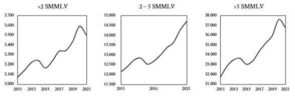 Como se mencionó, las cotizaciones provienen del pago obligatorio del 12,5% liquidado sobre el Ingreso Base de Cotización (IBC) de los afiliados al régimen contributivo. De este porcentaje 4% lo asume el trabajador y 8,5% el empleador7. Con el fin de reducir la informalidad laboral mediante la reducción de los costos de contratación de las firmas, la Ley 1607 de 2012 exoneró a las empresas de pagar la cotización de salud sobre los trabajadores con 10 Salarios Mínimos Mensuales Legales Vigentes (SMMLV) o menos. Esta reforma, redujo el flujo de recursos hacia la cuenta de compensación del FOSYGA por lo cual el Estado debió asumir el desfase financiero que ello generó mediante la asignación parcial de una renta con destinación específica denominada Impuesto de Renta para la Equidad (CREE) que estableció la misma norma. Posteriormente, la Ley 1819 de 2016 eliminó este impuesto y dispuso que un porcentaje del recaudo del impuesto de renta se asignara para el financiamiento del sistema de salud, el SENA y el ICBF. Más adelante, la reforma tributaria de 2019 (Ley 2010) redujo de forma gradual los aportes a salud de los pensionados que perciben entre uno y dos salarios mínimos. Con estos cambios normativos, los ingresos provenientes de las cotizaciones que eran la principal fuente de recursos del sistema descendieron de 2,4% del PIB en 2011 a 1,9% del PIB en 2014. A partir de 2015, esta fuente de recursos se estabilizó alrededor de 2,0% del PIB (Gráfico 1, Cuadro 1).