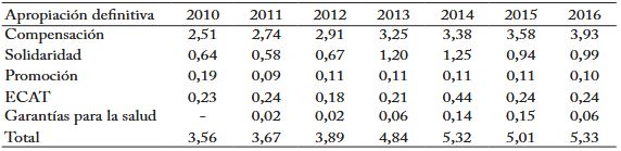Por su parte, la subcuenta de promoción se nutría con un porcentaje hasta del 1% sobre la tarifa de cotización del régimen contributivo y con las transferencias del Ministerio de Salud y Protección Social, y el impuesto a las municiones y los explosivos. Estos recursos se asignaban a actividades de información, educación y fomento de la salud. La subcuenta de accidentes de tránsito y riesgos catastróficos tenía como fuente de ingreso las transferencias de las aseguradoras autorizadas a expedir el Seguro de Accidentes de Tránsito (SOAT). Los recursos estaban asignados al pago de servicio de salud para las personas que no estuvieran amparadas por el SOAT o para las personas afectadas por eventos catastróficos o por el terrorismo. Por último, la subcuenta de garantías para la salud, creada en 2011, se alimentaba fundamentalmente con los aportes del PGN y tenía como propósito suministrar liquidez a las instituciones del sector para asegurar su funcionamiento mediante la prestación de servicios y el apoyo a los procesos de intervención, liquidación y reorganización de los prestadores de servicios de salud.