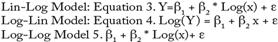 Equation 2 represents the usual Lin-Lin Model, some transformations over the independent and/or dependent variable can be made such as the ones describes in equations 3, 4, and 5 (Log-Log Model 5).