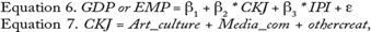 The endogenous variable is the local GDP or employment for cities in Germany and Spain, that measures the economic performance of a particular territory in a given period which could be quarterly, monthly, or yearly. This study uses yearly data. The exogenous variables are three general explanatory variables from the creative industries: Creative and Knowledge-based Jobs (CKJ) (Equation 7) and Intellectual Property and Innovation (IPI) (Equation 8). The general equation is the following: