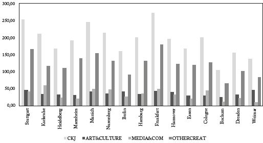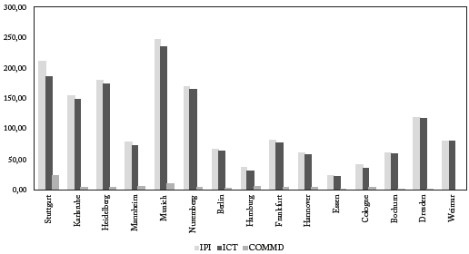 As opposed to Spain, Germany has a larger Intellectual Property and Innovation (IPI) subsector. In addition, the Creative and Knowledge-based sector (CKJ) plays a significant role in Germany. In Munich, Stuttgart, and Frankfurt, CKJ is more prevalent, and in Heidelberg, Munich, and Stuttgart, IPI is more prevalent.