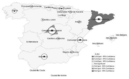 In Spain, it has been determined that the regions of Comunidad de Madrid and Catalonia exhibit hotspots or high spatial association, indicating significant clustering in the cultural and creative industries.