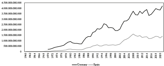 There is a considerable difference between Germany and Spain in terms of their economic positions within the European Union. In the European Union, Germany is one of the leading countries, while Spain is far behind. The German GDP in 2021, was 4.2 billion dollars, while the Spanish GDP was 1.4 billion dollars, which translates into 29,14 percent and 9,83 percent of the European Union's GDP, respectively (World Bank, 20221)(Figure 2).