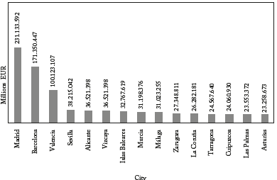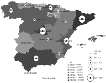 In Spain, the most important cities in terms of GDP in 2018 are Madrid, Barcelona, and Valencia, which represent 40,44% of the GDP in Spain. The first fifteen cities represent 69,03% of all the economic activity (Figure 3). Concerning the spatial patterns, it is clear that there is a positive correlation between a high GDP and high levels of employment in cultural and creative industries. (Figure 4).