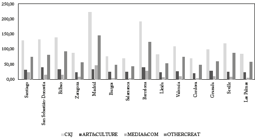 The selection of the cities in this study to measure the econometric relationship between employment in the cultural and creative industries (CCI) and employment in the corresponding municipalities/ regions in Spain and Germany was based on their inclusion in the Cultural and Creative Cities Monitor index.