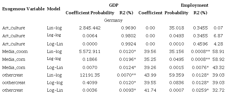 In contrast, Germany has rejected most of the Lin-Lin and transformed models for IPI as well as for some variables of the CKJ, particularly Art and Culture. Although many of the run models considered the individual significance of the exogenous variables, the R-square criterion indicated that with few exceptions, the explanatory variables explained too little about GDP and employment, despite the general acceptance of their significance.