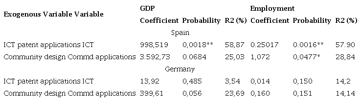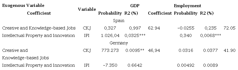 Based on the Lin-Lin model, the results indicate that in Spain, the only significant variable for both GDP and employment as endogenous variables is IPI. This suggests that intellectual property and innovation jobs explain GDP and employment in Spain. In Germany, only CKJ passed the individual test, and the t-student test showed that both CKJ and IPI were significant for employment as an endogenous variable. Although CKJ and IPI passed the individual tests, their R-squares are too low, at 46.94% and 41.90%, respectively, indicating that they cannot adequately explain GDP and employment (Table 7).