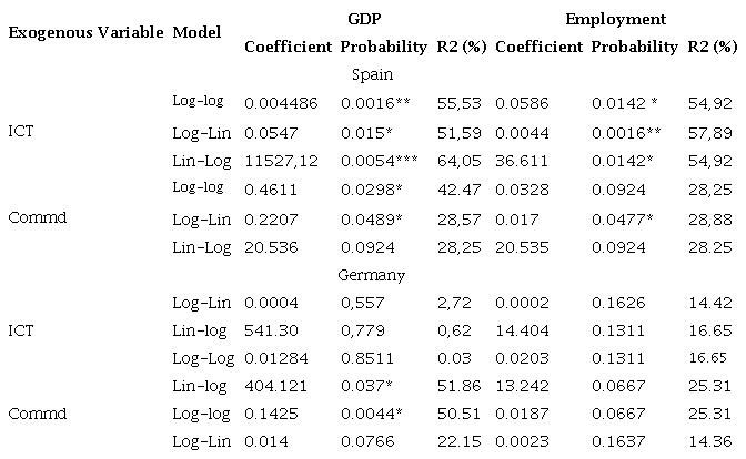 For the variable IPI, the sub-industries are ICT and Commd (see Figure 1 and Equation 8). In Spain, using a Lin-Lin model, ICT is significant, the R-squared is near 60% for both cases, GDP and employment (Table 11). The highest value is reached with the Lin-Log model (R-squared 64%) (Table 12). In the Lin-Lin model from Germany, every variable is significant (Table 11). However, in the transformed models-Lin-Log and Log-Log-only the variable Commd is significant, and the R-squared value reaches just 50% (Table 12).