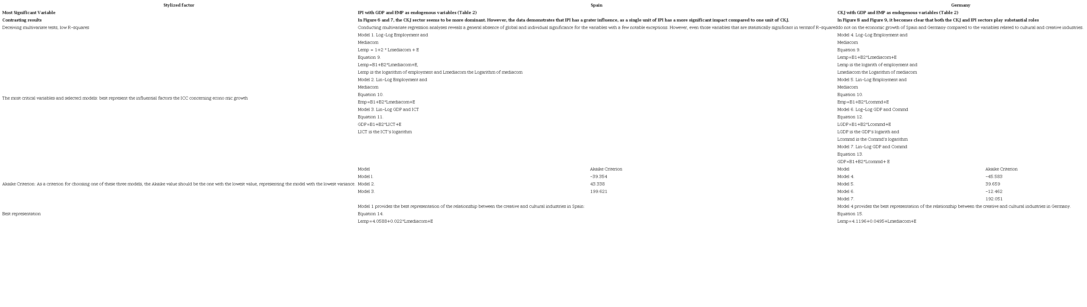 After examining the high R-squared values of the models, three models were selected for Spain and four models for Germany. The Akaike criterion was applied to determine which model had the lowest variance. Ultimately, both Spain and Germany were fitted with a Log-Log model with the endogenous variable being the logarithm of employment and the exogenous variable being the logarithm of jobs in media and communications, which corresponded to the CKJ sector.