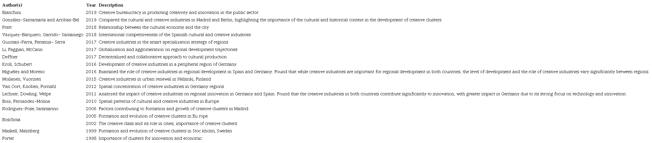 Florida (2002) has underscored the importance of creative clusters in fostering economic and social development in cities. Other studies have investigated the relationship between creative industries and urban development, regional development, and smart specialization strategies (Boix & Fernandez-Molina, 2010; Guzman-Parra & Femenia-Serra, 2017; Li et al., 2017; Moilanen & Vuorinen, 2015). The following table summarizes the main literature contributions on this topic for Spain and Germany (Table 1):