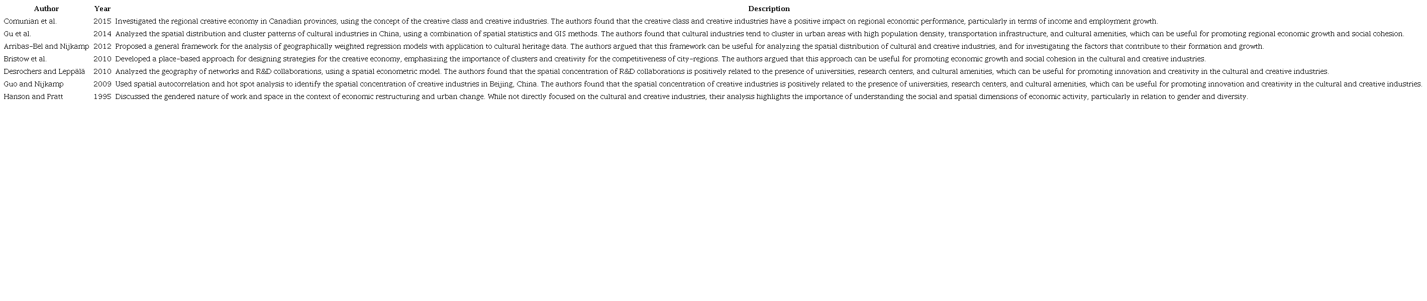 The studies in the table analyze the spatial distribution, clustering, and factors contributing to the formation and growth of cultural and creative industries using various methods, such as spatial statistics, GIS, and spatial econometrics. They cover diverse geographical areas, including China (Gu, 2014), Canada, and European regions, and emphasize the importance of elements like universities, research centers, and cultural amenities. Additionally, the studies address topics like the creative economy, gendered work and space, and the impact of the creative class on regional economic performance. A summary of this literature is as follows (Table 2):