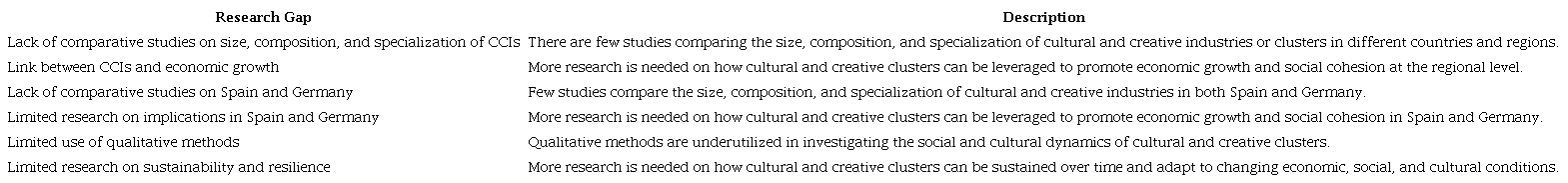 This scarcity of research impedes a comprehensive understanding of the factors that contribute to the success or failure of CCIs in both countries. Specifically, the historical antecedents that have contributed to the establishment of the current governance framework in Germany and Spain, as well as the spatial patterns that exist at the regional level, particularly about CCIs, require further investigation. Additionally, research is needed to explore the CCI factors that have the greatest impact on GDP and employment in both countries. These research gaps represent important avenues for further investigation to develop a more complete understanding of the development and impact of CCIs in Germany and Spain.