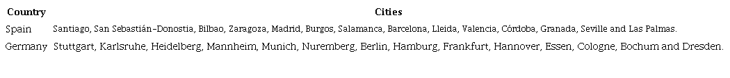 To gain a deeper understanding of what has happened on a local level, cross-sectional data from the Cultural and Creative Cities Monitor has been used to select fourteen Spanish and German cities with the highest GDP and employment levels in 2019. To measure the level of GDP before the pandemic as well as the economic contribution of the cultural and creative industries, this data set was selected.