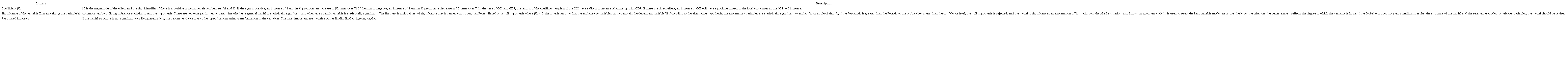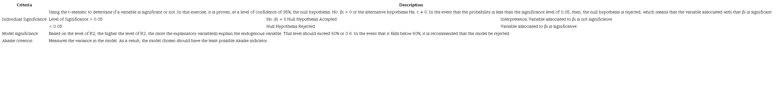 This section provides the results of the model based on equation 6. The criteria to determine what model is going to be chosen is based on three indicators, described in the following table: