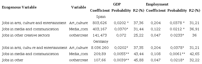 However, despite the statistical significance, the R-squared values for the selected models in both countries were not particularly high, indicating that the explanatory variables may not fully account for the variations in GDP and employment. It is worth noting that public expenditure in the cultural and creative industries could have a positive impact on their development and contribution to regional economic growth in Spain and Germany.