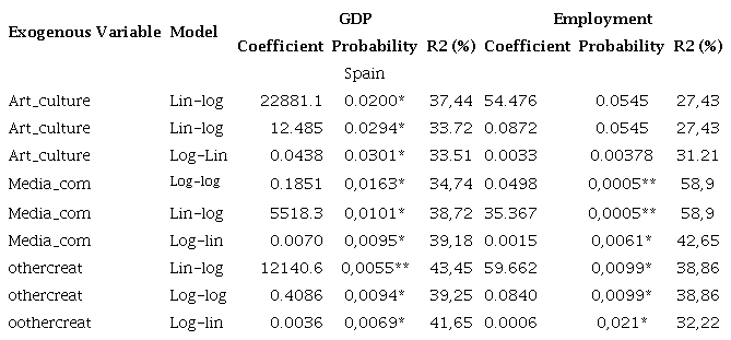 In Spain, most of the models for the CKJ sector were accepted, except some of the transformed models in the arts and culture sector, in which employment was endogenous. Additionally, the IPI sector has been widely accepted in individual significance tests.