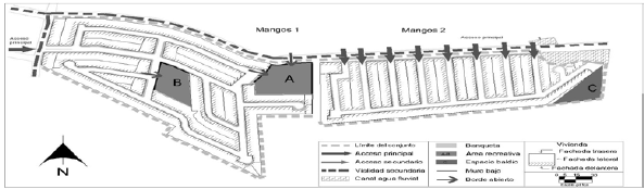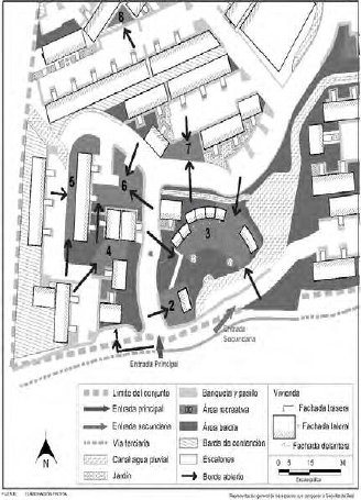 El paradero de camiones (1), el acceso peatonal (2) y la plaza principal (3) están interconectados con la vía terciaria, la cual comunica con el centro urbano de la ciudad y con la vía colectora del conjunto habitacional, que tiene entre ocho y diez conexiones con el resto de las vías locales. Los espacios 2 y 3 forman una plaza con dos bordes libres (hacia la vía terciaria y colectora), en colindancia con la fachada delantera de unos locales comerciales, un terreno baldío y un canal de agua pluvial y aguas negras.