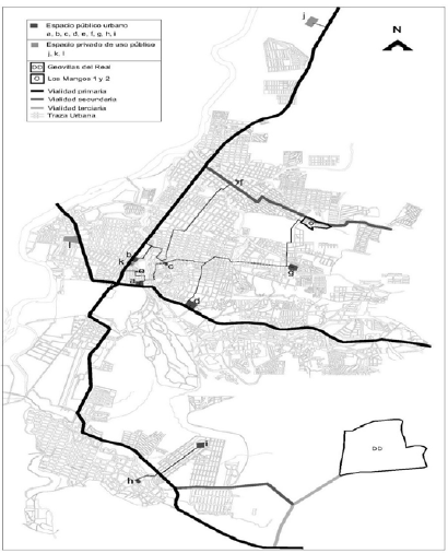 De acuerdo con los resultados de la encuesta,13 los habitantes de Geovillas del Real y Los Mangos 1 y 2 manifestaron la necesidad de un mayor acceso a diversos servicios, equipamiento urbano y lugares de trabajo (85 y 65 por ciento, respectivamente). Subrayaron la necesidad de acceso a los espacios de uso público recreativo y deportivo (a, b, c, d, e, f, g, h, i), pues los existentes sólo los utilizan “cuando pueden”, dada la lejanía, la inversión en tiempo y costos que deben realizar. Asimismo, resaltaron el uso del espacio privado de uso público: los centros comerciales j, k, y l (Mapa 1). En Geo-villas del Real, la distancia media al equipamiento público y privado es de 11.16 km; el tiempo promedio de espera y traslado en transporte público es de una a dos horas. En Los Mangos 1 y 2, la distancia media es de 6.16 km; el tiempo de espera y traslado en transporte público es de una hora máximo; con un costo de 18 pesos por persona, ida y retorno, para ambos conjuntos.