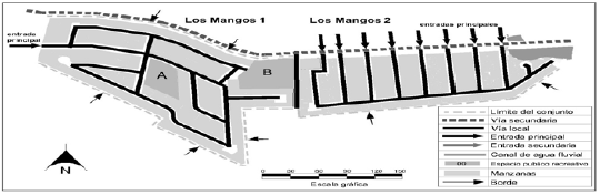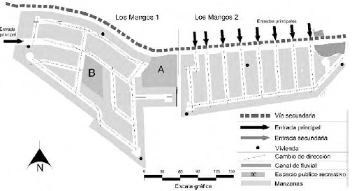 En ambos conjuntos habitacionales, las manzanas tienen varias dimensiones (Cuadro 2), en el cálculo de la media y la mediana, el intervalo señalado como adecuado se cumple sólo en uno de los lados de las manzanas. En cuanto a la moda, sólo uno de los lados se encuentra dentro del intervalo adaptado a las necesidades humanas (Mapas 2 y 3). En particular, Los Mangos 1 y 2 tiene una estructura vial que lo fragmenta, de ahí que esté dividido por su forma y función en dos zonas.