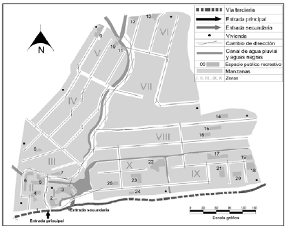 Para facilitar la evaluación del conjunto Geovillas del Real, lo dividimos en diez zonas, con base en las vías locales que desembocan en la vía colectora, ligada a la entrada principal (Mapa 4); después, de cada zona tomamos la vivienda más alejada al acceso principal y a cada espacio recreativo con más frecuencia de uso. Según los resultados de la encuesta, la mitad de la muestra contestó que utilizaba con más frecuencia los espacios 2, 3, 17, 18, 20, 21 y 22.