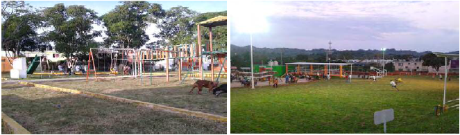 En Los Mangos 1 y 2, el espacio recreativo se dispone de manera concentrada, lo cual facilita la diversidad de oportunidades y, por ende, el tipo de apropiación y uso heterogéneo. Aunque el área recreativa también surge del espacio residual, que parece elegirse con criterios diferentes que comprenden la función y el diseño adecuado.