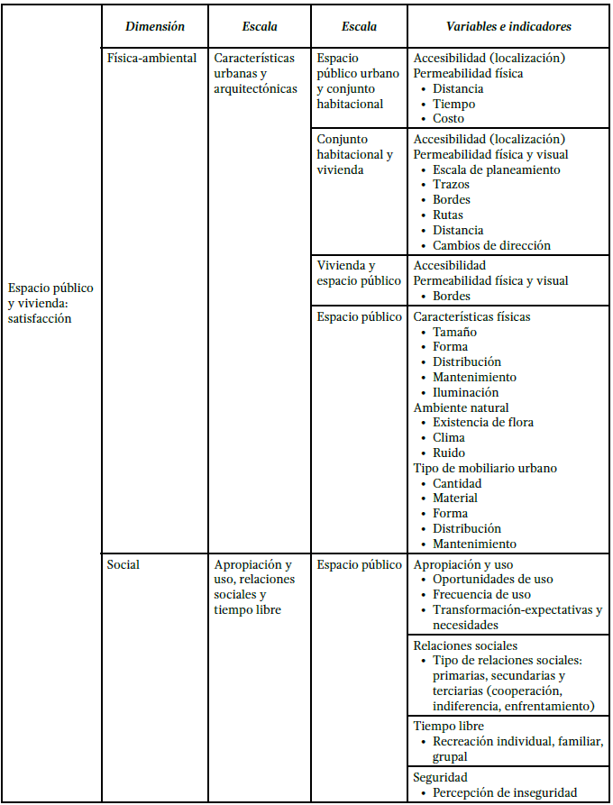 Otro trabajo muy importante orientado a las condiciones de vida es el realizado por Villavicencio et al. (2000: 9-23) en el Distrito Federal, quienes proponen tres dimensiones de análisis del espacio: física, económica-social y urbana. En esta investigación adoptamos las condiciones materiales, el tamaño y el estado constructivo de la vivienda, en adición a las del espacio público, ya señaladas en Segovia (2005). Respecto de las variables de la dimensión urbana que proponen, consideramos algunas que nos sirven para retomar las tres escalas espaciales: la ubicación urbana de la vivienda, la relación de ésta con el resto de la ciudad, la disponibilidad del equipamiento, los vínculos y las relaciones vecinales, y las características del medio ambiente (Villavicencio et al., 2000: 26-27).