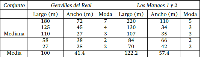 En Geovillas del Real y Los Mangos 1 y 2 existen restricciones en cuanto a accesibilidad, por lo tanto, son similares en la apropiación y el uso de ciertas áreas, debido a la estructura de las vías, la dimensión de las manzanas, la distancia, el tipo de borde, el número de rutas y los cambios de dirección. Pero, aun así, las limitaciones de Geovillas del Real son en mayor escala (tres veces más) en comparación con Los Mangos 1 y 2, en lo que se refiere a la distancia por recorrer, el tamaño de las manzanas y los cambios de dirección.