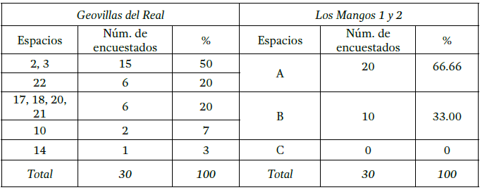Analizamos los emplazamientos recreativos de los conjuntos habitacionales, es decir, las plazas, el área de juegos infantiles, los módulos deportivos y las zonas de bancas y mesas de convivencia. Por una parte, los espacios recreativos utilizados con mayor frecuencia en Geovillas del Real son 2, 3, 17, 18, 20, 21 y 22, y en Los Mangos 1 y 2 es el “A” (Cuadro 3). Para los fines de nuestro análisis, en Geovillas del Real retomamos el primer sistema de emplazamiento; ahí están representados los espacios recreativos con frecuencia de uso mayor y menor.