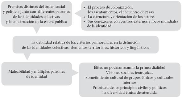 La institucionalización del programa de las modernidades occidentales va a la par de las versiones distintivas de construcción de las fronteras de las colectividades y sus identidades; esto es, se desarrollan nuevas definiciones concretas de los componentes básicos primordiales, civiles universalistas, y sacrotrascendentales de las identidades colectivas, de modo que las condiciones de membresía en el sistema social se reestructuran.