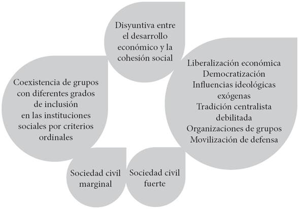 Su estudio pone en evidencia un tipo particular de modernización en América Latina simultánea a los procesos de globalización y glocalización que conllevan un lado oscuro; pero esto no debe interpretarse como una desintegración en general, sino como una integración ex negative , al igual que como una tensión y contradicción entre los criterios heterogéneos de las condiciones de membresía y sus posiciones de estatus, por ejemplo entre la construcción occidental de la ciudadanía y las condiciones etnonacionales de membresía.