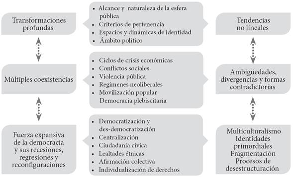 "Compromisos con la democracia representativa y baja confianza institucional, alteración de las normas procedimentales, cierre autoritario y control de las esferas públicas", y