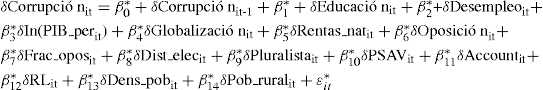 Adicionalmente, y reconociendo los problemas a los que se enfrenta la literatura empírica, este trabajo también constata —en primer lugar— algunos de sus hallazgos comunes, pero también para dar luces sobre aquellos otros casos en los que no hay acuerdo (por ejemplo, tamaño promedio de los distritos electorales) o por lo menos para sugerir qué aspectos explican la falta de unanimidad en lo práctico. Por lo tanto, se incorpora un mayor número de controles, que incluso dan cuenta del equilibrio de poderes entre el gobierno y la oposición; se prueban diferentes alternativas para medir algunas variables, como es el caso de la corrupción que se capta a través de dos índices de percepción —uno elaborado por Transparencia Internacional (denominado CPI) y el otro por el BM (denominado CE)—; y se indaga sobre asuntos como la autocorrelación y heteroscedasticidad, por lo que se usan dos técnicas de estimación: errores estándar corregidos para panel —incluyendo un factor autorregresivo— y modelos dinámicos según la metodología de Arrellano y Bond (1991).