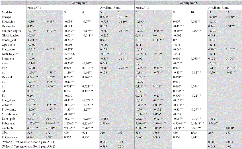 Por lo tanto, se emplean dos técnicas econométricas que permiten corregir parcialmente los problemas hallados, de una parte los errores estándar corregidos para panel (PCSE), propuesta por Becky Katz (1995), incluyendo estructuras autoregresivas (a través de transformaciones Prais-Winsten), y de otra el método generalizado de momentos de Arrellano y Bond (1991), en el que se transformaron las ecuaciones en niveles a ecuaciones en diferencias y se incorporó el rezago de la variable dependiente. Por otra parte, la introducción de diversas variables culturales y políticas ayuda a reducir la probabilidad de ocurrencia de problemas de endogeneidad que pueden surgir, entre otras causas, por la exclusión de factores relevantes; sin embargo, lo anterior no es garantía de que los potenciales determinantes tratados en este trabajo sean efectivamente exógenos.