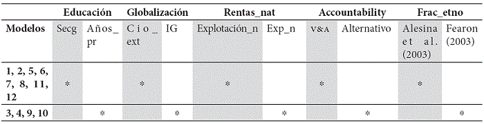 Los modelos no solo difieren por la técnica de estimación o índice de corrupción que utilizan, sino también por las proxies empleadas para algunos factores explicativos. Según se ilustra en la tabla 3, se optó por dos casos extremos: primero se introdujeron las variables explicativas utilizando las medidas tradicionales (columnas sombreadas en la tabla 3); posteriormente, y cuando fue posible, se acudió a medidas alternativas.