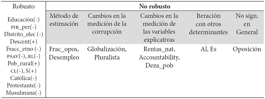 Aunque esta sección hace una revisión de los resultados econométricos, no profundiza en la justificación de todas las correlaciones que se pueden considerar robustas, de acuerdo con la coherencia de los respectivos signos obtenidos en las estimaciones intermedias o su significancia estadística, pues ello supondría repetir información que ya se presentó cuando se revisó la literatura. Se prefiere considerar en especial las razones que en el escenario cuantitativo explican la falta de unanimidad, para posteriormente clasificar los potenciales determinantes de la corrupción según el modo cómo las respectivas correlaciones estadísticas cambian en función de ajustes en la medición, técnicas de estimación empleadas o la iteración entre variables exógenas dependiendo de cuáles se incorporan en las regresiones.