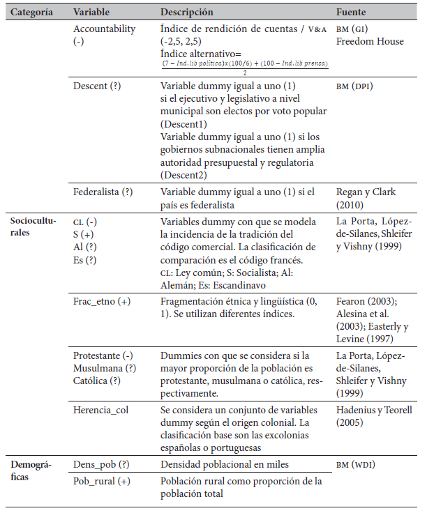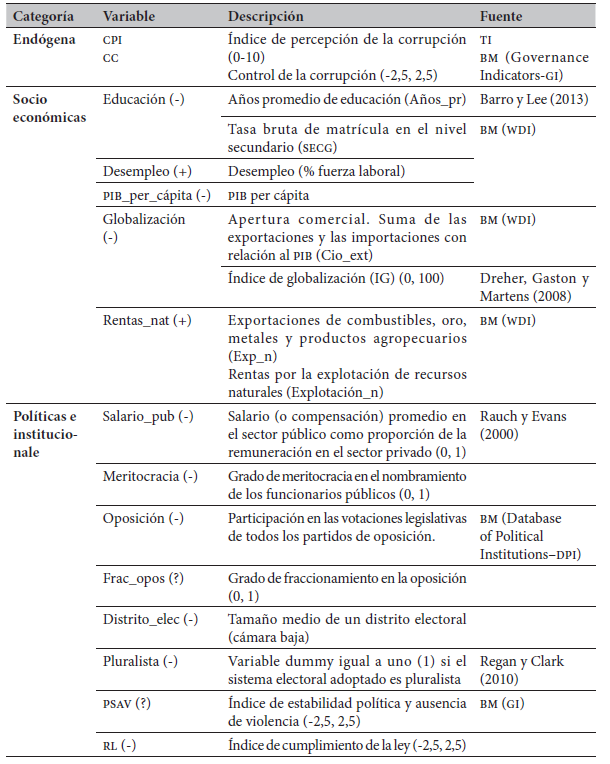 A continuación se presentan las variables que previamente han sido consideradas por la literatura como potenciales determinantes de la corrupción, y que deberán ser tenidas en cuenta en el ejercicio empírico que se desarrolla más adelante, junto a otras que propone este estudio (resaltadas en gris). En la tabla 1 se observan las variables endógenas (índices de percepción de la corrupción) y exógenas (determinantes) analizadas, junto a una propuesta de clasificación, los signos esperados de las respectivas relaciones estadísticas con base en la revisión del estado del arte, las alternativas de medición y las fuentes empleadas. Además, en la justificación teórica que sigue no solo se mencionan las razones que usualmente aparecen en la literatura; también se argumenta, cuando es pertinente (es decir, cuando hay un aporte), cómo cada factor puede incidir en determinados comportamientos de la sociedad ante la ocurrencia de hechos de corrupción.