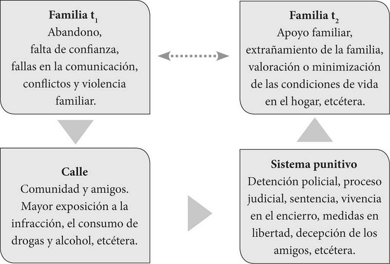El proceso de orillamiento no es absoluto, la familia y la calle mantienen una relación dialéctica sin interrupción en la mayoría de los casos, empero, sí es posible diferenciar una alternancia en el protagonismo que tienen en la vida de los adolescentes. Así, en un segundo momento marcado por la infracción y la reacción del sistema punitivo, la familia -que parecía ser el factor de riesgo a huir- es, en realidad, el factor de protección al regresar. Lo expuesto se puede ilustrar de la siguiente manera: