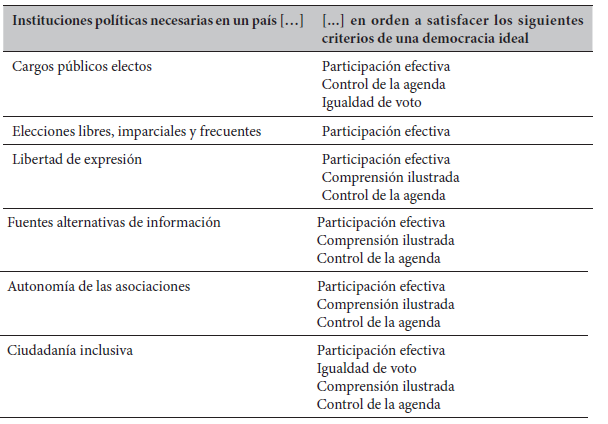 Al adoptar la definición de democracia de Robert Dahl seguida por Leonardo Morlino, que presupone su concepción de calidad democrática, verificamos seis rasgos institucionales que permiten distinguir los regímenes democráticos del resto: cargos públicos electos; elecciones libres, imparciales y frecuentes; libertad de expresión; fuentes alternativas de información; autonomía de las asociaciones; y ciudadanía inclusiva. A continuación, Dahl enuncia otros seis rasgos específicos para una democracia "ideal" que guardan relación con cada uno de los rasgos institucionales ya mencionados: participación efectiva; igualdad de voto; comprensión ilustrada; control de la agenda; inclusión; y sistema de derechos fundamentales.