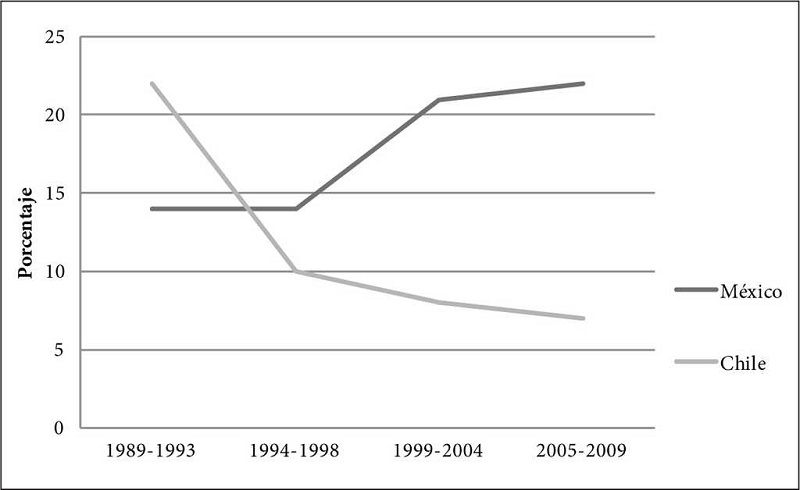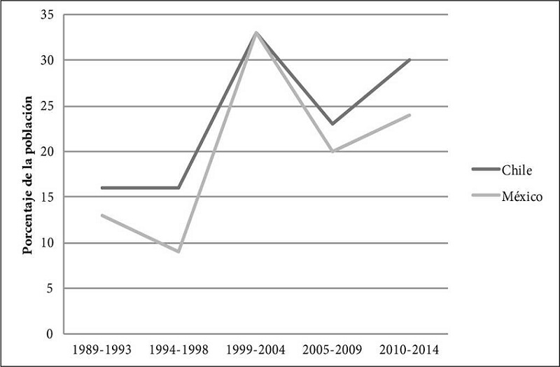 La aspiración de las sociedades chilena y mexicana por una mayor igualdad ha venido en aumento desde finales de la transición a la democracia a la fecha, es decir, el proceso de liberalización política que condujo al cambio de régimen político en ambos países atrajo una mayor demanda por la igualdad económica que, si bien se observa oscilante, tiende hacia el alza.3 Así, por ejemplo, en el caso chileno durante los períodos 1989-1993 y 1994-1998, solo 16% de la población afirmaba que los ingresos debían ser más igualitarios; esta proporción llegaría a 33% -su nivel más alto- de 1999 a 2004; descendiendo en 2005-2009 a 23% y recuperándose a 30% de 2010 a 2014 (Encuesta Mundial de Valores, 2014). En México, por su parte, el porcentaje de población a favor de una mayor igualdad en los ingresos ha variado de 13% en el primer período a 9% en el segundo, 33% en el tercero -que al igual que en el caso chileno es el más alto-, 20% en el cuarto, llegando a 24% en el último (Encuesta Mundial de Valores, 2014).