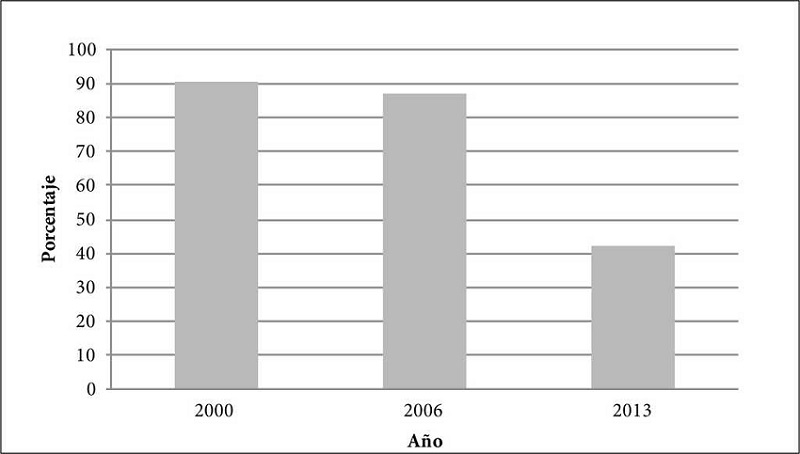 Por otra parte, analizando la participación electoral, identificamos una trayectoria oscilante hacia la baja: mientras para el año 2000 la proporción de quienes acudieron a las urnas fue de 63.9%, en 2006 descendió a 58.5% repuntando en 2012 a 63.1% (IDEA, 2014). Asimismo y en contraste con lo que sucede en Chile, México es uno de los países con los niveles de participación en protestas más bajos, solo 3.8% de la población se ha involucrado en ese tipo de acción colectiva (Barómetro de las Américas, 2013a: 81), un hecho que puede verse reflejado también en la reticencia a participar en acciones políticas no formales o no institucionales. La proporción de quienes afirmaron que nunca realizarían acciones de este tipo, aumentó de 1% en el período 2005-2009 a 64% de 2010 a 2014 (Encuesta Mundial de Valores, 2014).