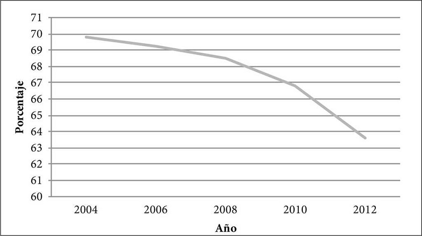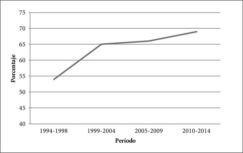 Por su parte, la estructura de clases que observamos en México es más asimétrica. La evolución que presenta su composición en del período 1994-2014 se distingue porque la clase trabajadora crece de 14% a 20%; seguida por la clase media alta que también aumenta de 16% a 21%. Sin embargo, la clase baja -considerada como aquella población en situación de pobreza- mantiene más o menos el mismo nivel durante todo del período. En ese sentido, según el Banco Mundial, la pobreza no ha disminuido en los últimos 20 años, pues su tasa es la misma que en 1992 (La Jornada , 2015b). Asimismo, y a diferencia del caso chileno, el tamaño de las clases medias en México es menor y, en términos generales, la estructura no muestra grandes cambios -sobre todo a nivel de la clase baja-.