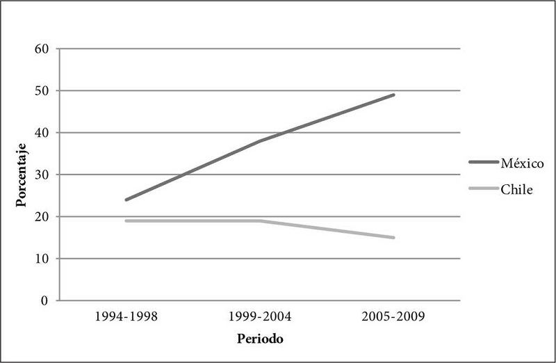 Asimismo, si pensamos en la competencia como un rasgo del individualismo meritocrático asociado al modelo de igualdad de oportunidades, observamos otro importante contraste entre ambas naciones. En ese sentido, los mexicanos que ven en la competencia un estímulo para que la gente trabaje intensamente creció de 24% en el período 1994-1998, a 38% de 1999 a 2004, alcanzando 49% de 2005 a 2009. En Chile ocurre la situación contraria: durante los dos primeros períodos el registro fue de 19%, proporción que desciende a 15% en el tercero (Encuesta Mundial de Valores, 2014), hecho que de cierta manera nos confirma la razón por la cual 84.7% de los chilenos manifiesta estar de acuerdo o muy de acuerdo con la idea de que cuando "el sistema económico lleva a la gente a competir, hace más difícil el afecto y la solidaridad entre las personas" (Mayol, Azocar y Azocar, 2013: 195).