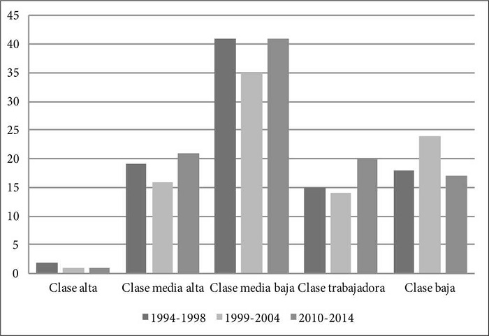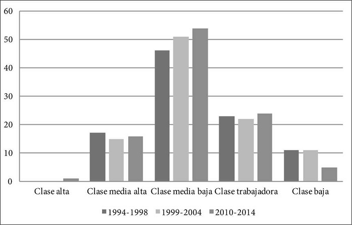 Ahora bien, ¿de qué tipo de estructura social emanan las apreciaciones de la desigualdad y la cultura democrática de los chilenos y de los mexicanos? Suponemos que las aspiraciones igualitarias de la sociedad chilena son tanto más coherentes cuanto más proclives a la democracia, porque devienen de una estructura de clases más simétrica, es decir, menos polarizada. En ella la probabilidad de que ciertos valores sean compartidos es mayor debido a que dentro de la estructura social los individuos mantienen una posición más cercana entre sí. En ese sentido, observamos dos hechos importantes en la evolución de la estructura de clases durante el período 1994-2014 que apoyan dicho supuesto: por un lado, la clase media baja se ensancha, pasando de 46% a 54%, mientras que por otro, la clase baja se reduce de 11% a 5% (Encuesta Mundial de Valores, 2014).