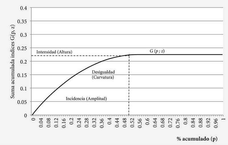 Con q como el número de pobres y z el umbral. La pendiente de la curva en un valor dado de p muestra la brecha de pobreza g (p; z). La curva es horizontal para todo p correspondiente a ingresos xi en o por encima del umbral de pobreza, ordenando los individuos de manera creciente 0 <x1 <x2<...<xn. Como la distancia o brecha g (p; z) es no negativa, G (p; z ) es no decreciente y cuando G (p = 1; z ) la curva es igual a la media de la brecha de la pobreza μg(z ).