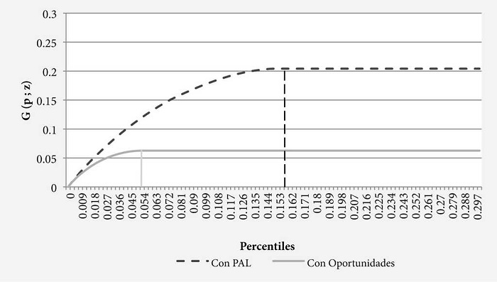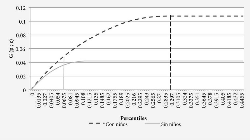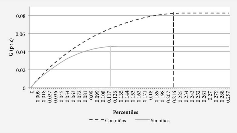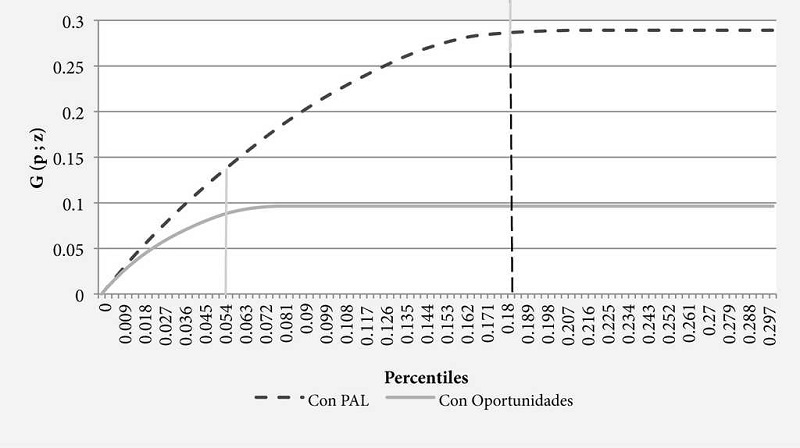 En este sentido, el uso de esta técnica solo nos permitirá observar la transferencia monetaria y su impacto en la condición del hogar, la que sencillamente debería estar mejor asignada en aquellos hogares que cuenten con niños menores de edad. La evaluación de la eficiencia de programas como el PAL no ha sido analizada con el enfoque metodológico de las curvas de pobreza.22