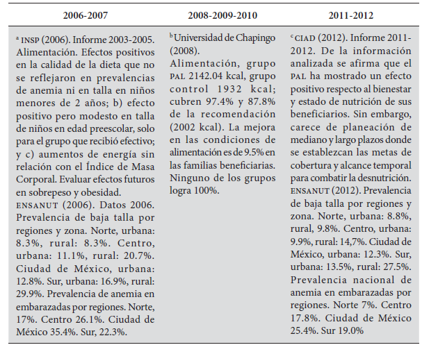 El cuadro 1 presenta de forma resumida los principales hallazgos de las evaluaciones externas al Programa de Apoyo Alimentario, las que -por cierto- carecen de periodicidad en su seguimiento a lo largo de la permanencia del programa; ante tal situación, los resultados se presentan de acuerdo con los tiempos en que fueron realizadas las evaluaciones tratando de contribuir al conocimiento del PAL.