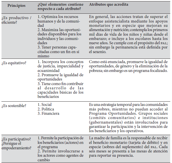 De manera general, la información del cuadro 2 muestra que el PAL contiene los lineamientos principales propios de una perspectiva centrada en el DH, al tiempo que cuenta con buena parte de los requisitos de cada uno de los atributos necesarios para considerar que cumple en su planteamiento con un adecuado apego a sus objetivos. La parte ejecutiva -que es la permanencia o sostenibilidad por sexenio- así como la equidad por la forma en que son elegidos los beneficiarios -focalización-, forman parte del programa aunque con limitaciones como son la temporalidad y la propia lógica de selección de los beneficiarios. Así, se considera que la equidad tiene el papel de ser la garantía que le otorga sostenibilidad a la eficiencia, a la ampliación de la base material. Si se supone que, de acuerdo con la teoría del capital humano de Becker (1993) y a la de las capacidades de Sen (1996), la fuente de la creación de riqueza es el individuo con todas sus capacidades y conjunto de conocimientos, habilidades y destrezas adquiridos a través del sistema educativo y cultural organizado cuya base lo constituye la alimentación y la salud, entonces, en este marco de análisis de resultados, a través de sus acciones el PAL contribuye al desarrollo de las capacidades básicas de los beneficiarios y a crear las condiciones para que superen la condición de pobreza desde el nacimiento.