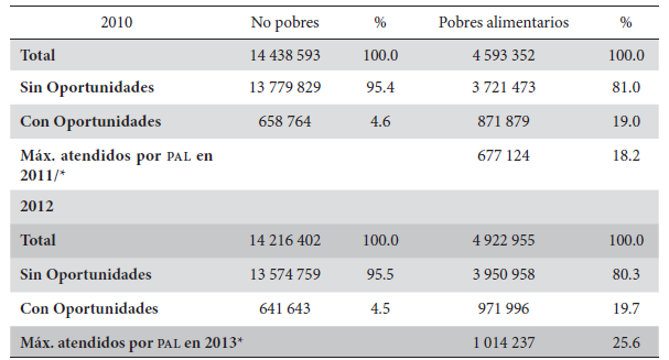 Como ya se mencionó anteriormente, en la práctica el PAL se conduce como complemento del Programa Oportunidades, específicamente en lo que se refiere a la parte operativa en tanto que ambos comparten la infraestructura y parte de su personal. Si bien lo anterior muestra un avance en la coordinación y la cobertura de dos programas que apoyan y benefician a un segmento de la población en condiciones de pobreza, aún quedan pendientes familias que no logran acceder a los programas de desarrollo social y quedan fuera de la posibilidad de mejorar su calidad de vida, poniéndose en cuestión la obligatoriedad que tiene el Estado de garantizar el derecho de las y los mexicanos a una alimentación nutritiva, suficiente y de calidad (Constitución Política, art. 4, Reforma del 2011).
