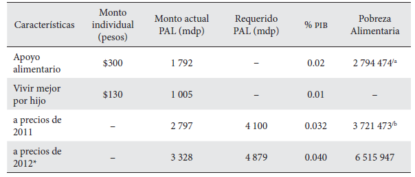 El programa se inserta en la Cruzada Nacional contra el Hambre, ya que busca cubrir a la población que no es atendida por el Programa Oportunidades, al tiempo que es un complemento necesario para la población que habita en localidades donde no existe capacidad de atención por parte de los servicios educativos, de salud y nutrición.2 En este sentido, el PAL representa un avance en la cobertura y la coordinación entre programas para la atención de la población más pobre. Se puede decir que el PAL es una estrategia alimentaria y nutricional de corto plazo que apoya a una política pública y aporta al desarrollo humano de las familias beneficiarías mediante su contribución al impulso de sus capacidades básicas en ausencia de fuentes de ingreso suficientes y seguras. En las evaluaciones recientes -2009,2010 y 2011- su calificación fue aprobatoria y se reflejó en los montos asignados para su ejercicio: en el primer año se ejercieron 1 204 millones de pesos mexicanos, en el segundo 3 545 millones, en el 2011 se le asignaron 4 099 millones y en el año 2012 un monto de 4 083 millones de pesos, cantidades expresadas en precios corrientes (Cámara de Diputados, 2012).