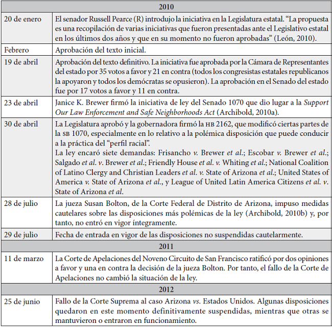 Diversas demandas fueron presentadas contra la misma ante los tribunales federales y algunas de sus disposiciones fueron preempted5 (“anuladas”) por la legislación federal de acuerdo con la doctrina de los plenos poderes del gobierno federal en materia inmigratoria. Ya que la Ley Arizona es una pieza más del complejo sistema legal estadounidense,6 en el que las disposiciones estatales pueden entrar en conflicto con la legislación federal y su destino ser decidido en los tribunales,7 el efecto dañino de la SB 1070 para los inmigrantes indocumentados fue disminuido. La tabla 1 muestra los hitos más destacados en cuanto a la evolución del proceso legislativo y judicial de la ley.